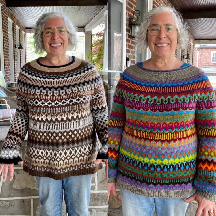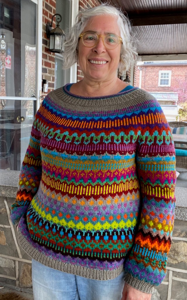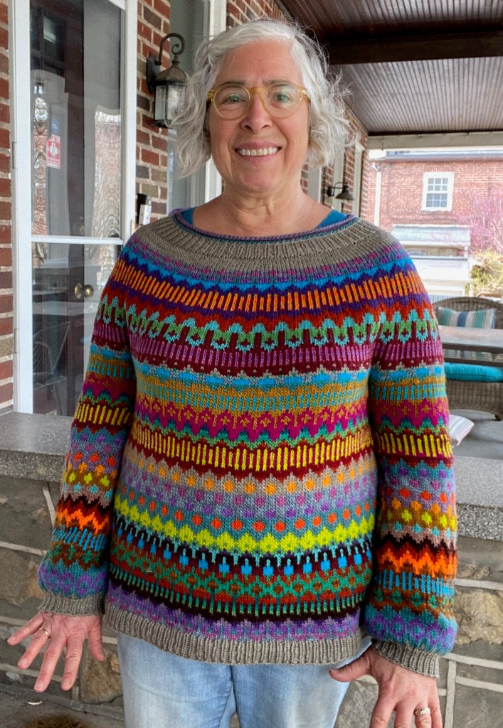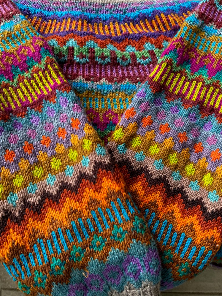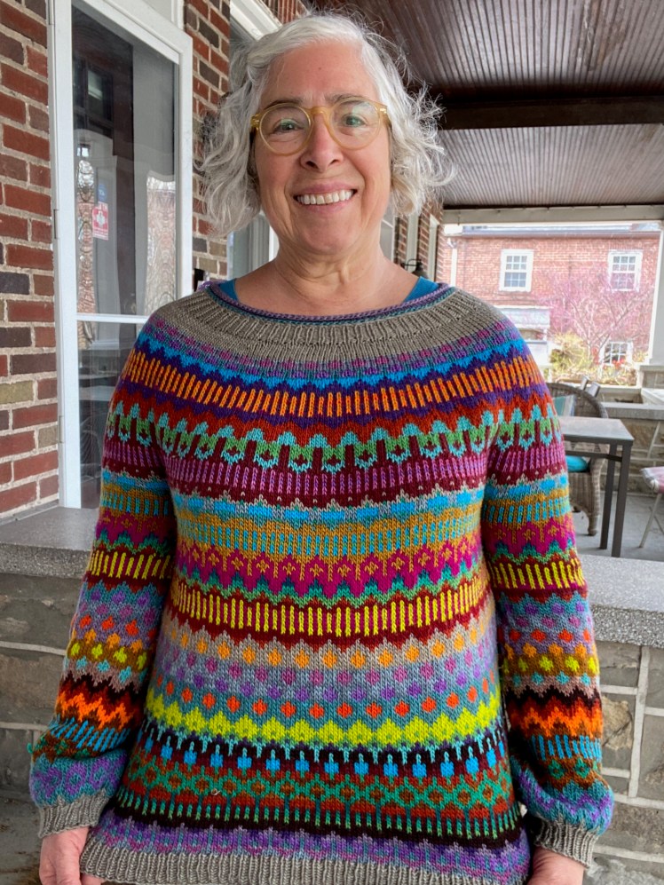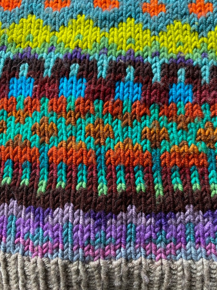 Since I often get compliments on the colors of this sweater from passersby, I can assume that the composition is pleasing at a quick glance, without requiring the viewer to get into a deep dive to sort out the blurry parts, like focusing only on the illuminated faces in a Rembrandt and then moving on. That’s fine with me, because I’m glad to have people engage with the composition with whatever attention they want to direct at it. Being intimately familiar with how and why I chose the colors I chose and placed them as I did, I get a lot of pleasure from looking at the sweater in low light or at a medium distance, because the lower visibility blurs the boundaries of the color changes in the gradients and makes them look smoother and more like the retinal image that guided my choices. In brighter light and at close range, I like to look at the sleeves below the orange zigzag to see the hue distinctions between the same-value turquoise and amber brown and the amethyst purple and grayish aqua right below. Those color sequences echoed, but didn’t replicate, color sequences at the same latitude at the bottom of the sweater toward the hem. In that part of the sweater, I really like the way the turquoise goes from a high-contrast pairing with a dark brown that gradates to the much lower contrast of the amber brown and rust. The composition looks very different depending on the light and from what distance it’s being viewed, which is the kind of under-the-surface surprise that entertains me a lot, even if I’m the only one who perceives it.
