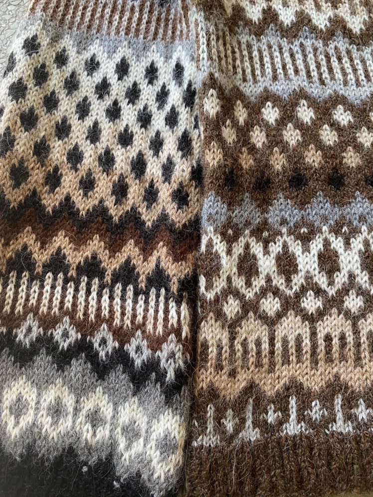Meanwhile, my daily perusal of my friends’ activity on Ravelry drew my attention to an Italian knitter’s particularly beautiful version of Caitlin Hunter’s Festive Doodle, knitted in Wollmeise fingering weight yarn. My stash has several lifetime quantities of Wollmeise in laceweight, fingering weight, and DK, and I started thinking about knitting the pattern in Wollmeise DK. I also started thinking about knitting the brown alpaca in Festive Doodle, combined with sport weight alpaca in natural colors, which had been sitting in my stash and begging me to knit it for the last three years. I swatched each set of yarns during the January 2022 Swatchathon.
