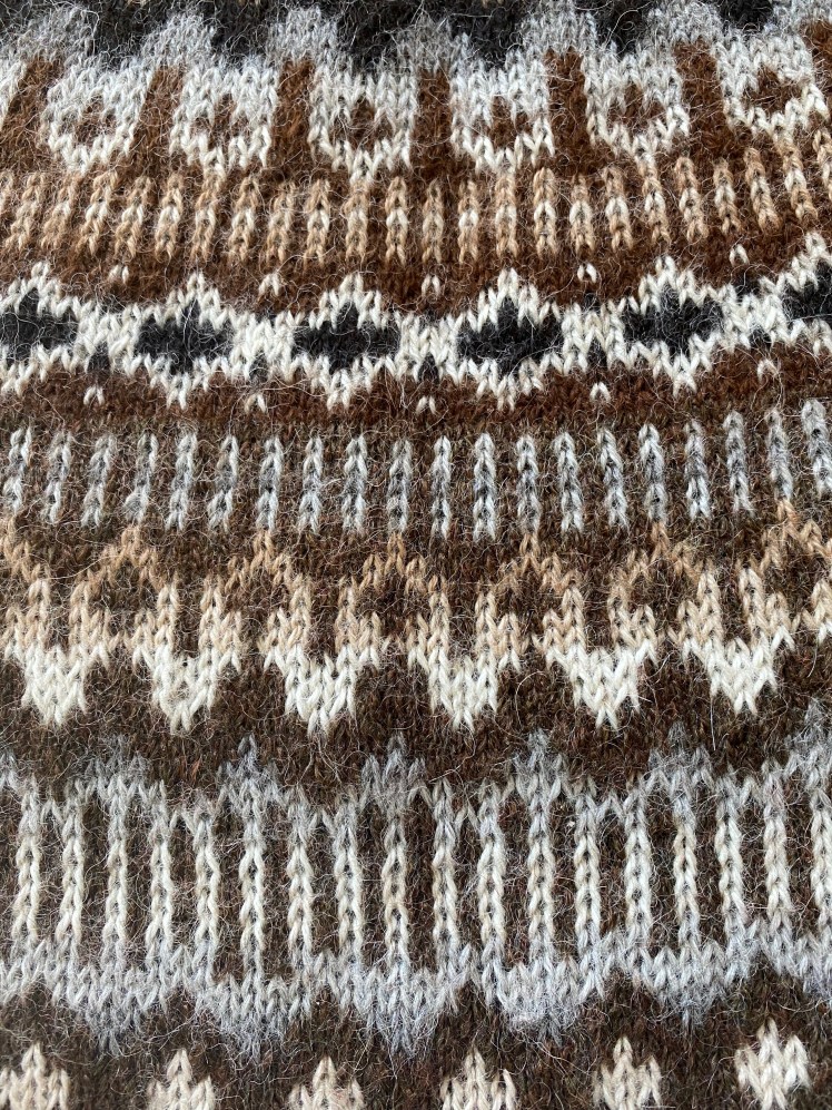 Here are a couple of detail shots of the body, where the brown worsted had to be used in every row and lighter value grays and cream/beiges were the contrast colors.