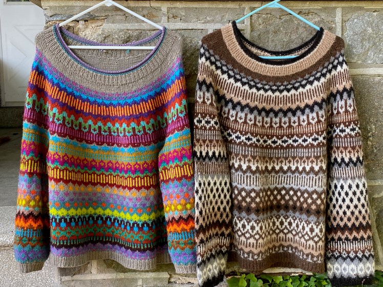 For the last three months, my handknitting life has been dominated by one pattern, knitted twice in very different colorways from yarn in my stash. The yarn that prompted my interest in this one versatile pattern wasn’t originally from my stash– I inherited it from a woman I never met, who destashed it to my yarn store owner friend Melissa, who bestowed it on me, as I detailed in my post Melissa’s Largesse. It was a sweater quantity of beautiful brown alpaca worsted yarn by Rowan, enough for a plain stockinette pullover or cardigan. I don’t knit plain stockinette unless I can do it on my knitting machine, because plain stockinette doesn’t soothe me, it anesthetizes me, and this yarn was too thick for my standard gauge Brother. So I went on the hunt on Ravelry for an idea or a pattern that would use the yarn in a way that would hold my attention.