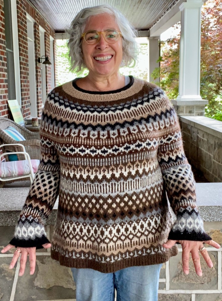 The point to this Doodle version was to use the brown alpaca worsted that I’d been given without running out. To economize on its usage, and also to save me from the brain-deadness of monochromatic stockinette, I paired it with thinner alpaca sport weight yarn in a variety of undyed, natural alpaca colors. The worsted/sport weight combination produced a heavier fabric with a larger gauge than the sport weight pairings, so I knitted the worsted/sport weight parts on a needle a size larger than the sport weight parts to equalize the feel of the fabric. That meant that I would get a larger gauge in the knitting where I used the worsted weight yarn, so I used the sport weight yarns in the yoke and arms and the worsted weight in the body to provide a bit more ease where I need it. This dictated a design decision. In the body, the worsted weight was to be used in every row, so that brown was a constant and the sport weight colors needed to contrast with it. I had a deep brown in sport weight that was too close to use there and a natural black that gradated with the brown, so I had to use that carefully in the body. In the body, my color pairings were limited by the fact that the brown worsted had to be one of the two colors and the other color needed to contrast with that brown. But I could use any combination I wanted to use in the yoke and arms because brown wasn’t hogging one color in a two-color pairing.