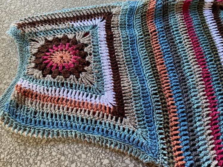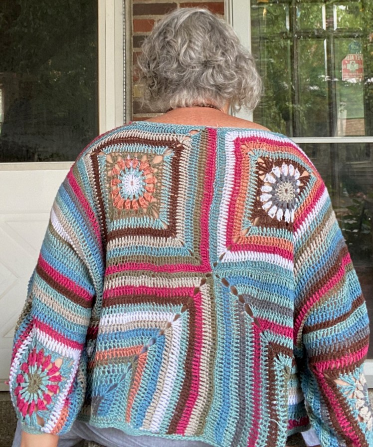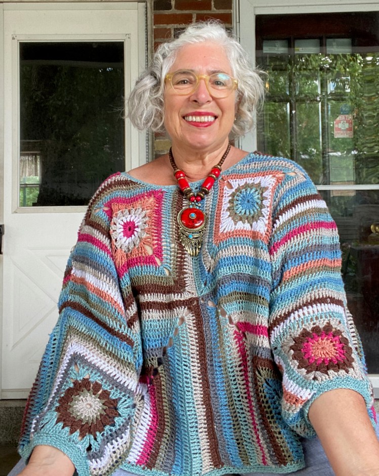 I followed a published pattern for this project, Floribunda in the Summer 2022 Pom Pom magazine. I followed it quite closely, mostly. I didn’t like the skimpy fit on the pattern’s model, so I sized it up for the oversized fit that liberates me from feeling trapped by my clothing and the sense that my clothes are wearing me instead of me wearing them. Also I used different colors and completely disregarded the pattern’s prescribed color rota. I never really wanted the long sleeves that the pattern gave instructions for, so I planned to abbreviate the sleeves by crocheting the mitered rows around the flower square motifs on only three sides. But I had made the pullover so oversized that I had to make the sleeves shorter, not to get short sleeves but to avoid sleeves that came down to my knees. I ended up with longish sleeves anyway, which I finished with a narrow edging of single crochet that cinched them in a bit.
