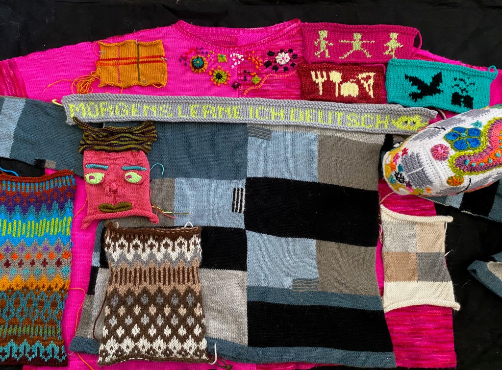 The most-transformed result of last year’s swatching was those cute little representations of my daily routine for a hønsestrikk sweater, the little swatches for bird-watching, food, yoga poses, the lettering about my daily German study. That turned into wearable political art about the U.S. Supreme Court.