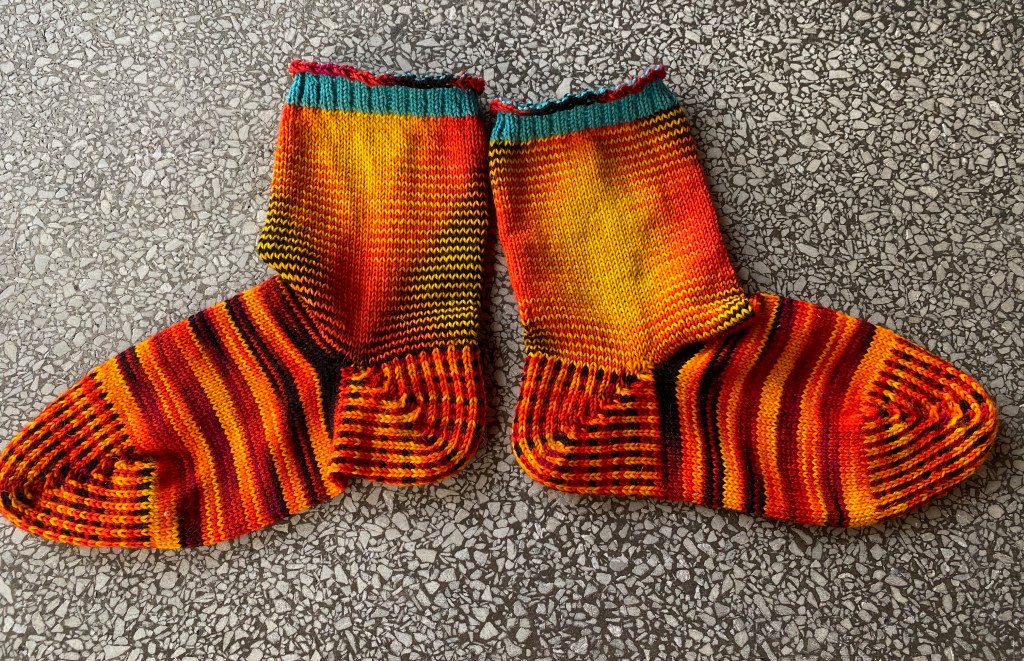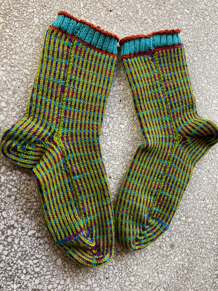 The sock on the left is the one with the failed no-sew seam. Lesson learned, I’ll seam socks that have yarn carried up from alternating stripes, because I have enough trouble with ends without adding yet more ends from the stripes