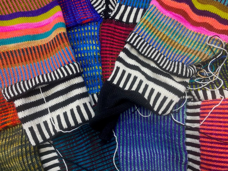 The knitting of the top part of the first sleeve went swimmingly. I loved the colors I chose for the two sections of six 4-row stripes. I think they’re going to inspire some future knitting. But I got to the end of the 96 rows and, thanks to the delusional thinking I described above, I was surprised by how short the sleeve looked. I think I also noticed finally that I had 82 stitches, not 72, on the machine, but decided that 82 stitches was fine for a cuff, then promptly returned to thinking that there were 72. Whatever I was thinking, this was not my finest instance of knitting math. Then I knitted a 12-row folded cuff edge of 1 x 1 black and white pinstriping with a hand-manipulated garter stitch fold line. This time the garter stitch manipulation was a little faster and less precarious. I was pretty sure there was a problem with the sleeve length that I was going to have to resolve somehow, but the solution was dropped into my lap by a brilliant British machine knitter named Von Morley, whose page, Machine Knitting Showcase, I follow on Facebook. She hadn’t liked the length of the sleeves on a recent creation, so she added an afterthought cuff in a different color. What a great design element! I let the idea take shape in my mind while I worked on the side join/sleeve bottom, and then could see just how short the sleeve would be when it was all knitted and joined in a tube.