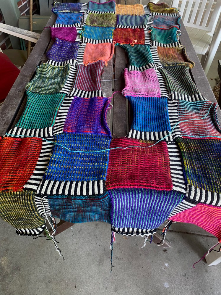 I don’t remember the thought process for getting from my swatches to the plan to use the Kurt design to apply the 1 x 1 pinstripes in colors and the 2 x 2 stripes in black and white. Probably there wasn’t one, because it was obvious. I also don’t remember if I had much of a color scheme in mind before I started knitting, but I knew that the repetition of the black and white stripes wending their way over the patchwork would be the unifying factor of the composition. I think I visualized using dark solids for the main color and a second solid color that would contrast only enough to be visible, but then I realized that the colors I already had wound in cakes were largely multis, and I wanted to use those leftovers before I wound more.