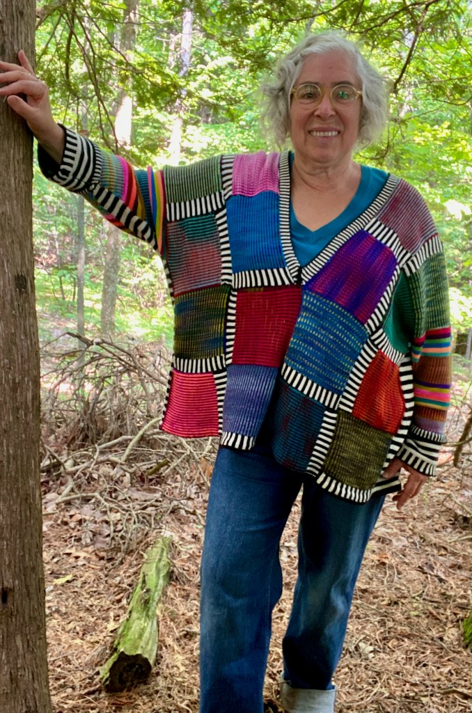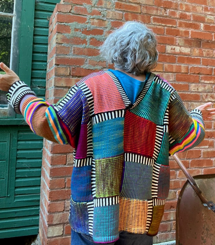 Eventually I knitted all the way up the body and then down the sleeves, with decreases on either side of the knitting every six rows. Meanwhile I was joining the top of the sleeve to the new knitting to align the colored 4-row stripes of the sleeve top with the black and white 4-row stripes of the sleeve bottom, thus forming the tube of the sleeve. Except that I realized, as I neared the end of the sleeve, that I wasn’t seeing a tube. I saw a knot. With growing dread, I took the stitches off the machine and onto a circular knitting needle to see how bad the situation was. It wasn’t just bad, it was really, really bad. I had knitted a Möbius strip. It was so bad that even frogging it was an exercise in yarn barf unfankling. I just turned off my emotions and frogged, unfankled, and tried not to repeat my previous error, which wasn’t easy because I didn’t know how I had done that error in the first place. There were several more attempts that did repeat my error before I stumbled onto the way to hold the patchwork front and back so that I was knitting up the sides on the inside of the knitting and forming a tube for the body and sleeve. You’d think that would be obvious. Well, I suffered to accomplish the obvious.