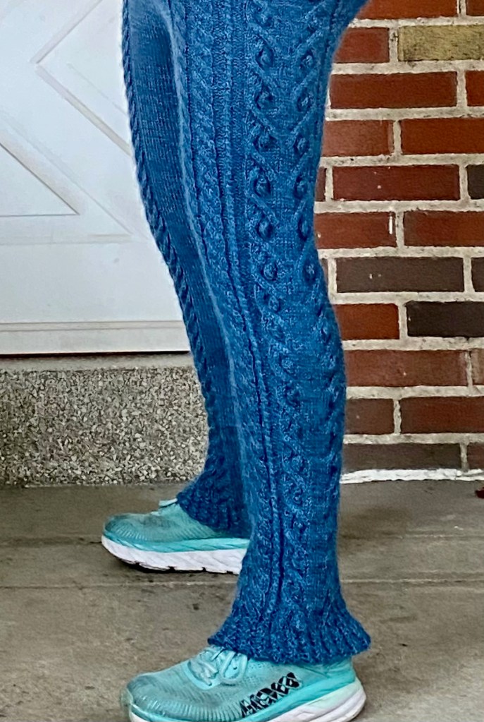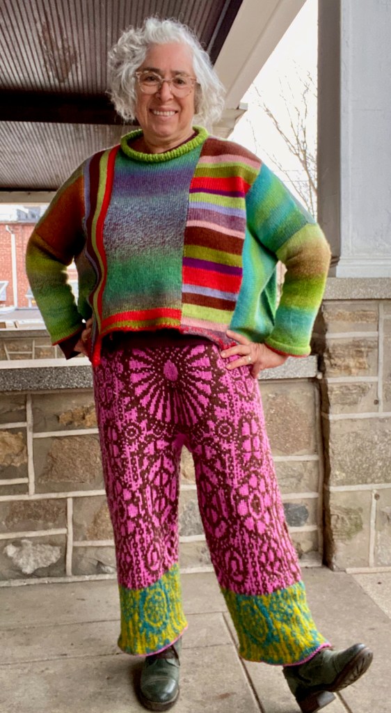 While I was knitting the lower torso, I was amused and maybe a little concerned by how far down my thighs the legs divide was going to land. Was I going to bring back Hammer pants? The legs were very big and roomy, and even though there were decreases five rows apart on the inside of each leg, the legs didn’t look very tapered at all. The crotch lands well below my actual body part, but it’s not Hammer pants. It’s big cozy sweat pants. Prior to washing and blocking, the pants fit me the way I wanted them to, but the yarn I used, Wollmeise Lacegarn, is a superwash yarn that stretches when washed and laid flat to dry. I might have decided not to wash the pants at all, but the pants had been in progress for about 7 months using yarn that I’ve had for many years, so they needed a good cleaning even before I wore them. So I washed them, wrung them out in the spin cycle, and threw them into the drier for a while. They were still damp, and when I held them up against my body, the waist came up to my armpits while the cuffs were at my feet. Back into the drier they went and stayed there until they were pretty completely dry and had returned to their intended size. The fabric was fluffy and cozy. When I wear them, I feel as if I’m wearing pajamas. They’re a little porous to wear outside on a cold windy day, and they lack pockets, which is a serious deficit, but I love wearing them.