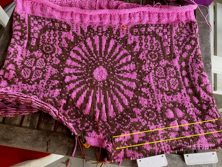 I had to put my pants on another month-long hiatus during birthday season, while I worked on the birthday sweaters and went on a focused campaign to finish the 2022 birthday blanket in time for the 2023 birthday. But once I got all that off my plate, I could focus on the legs of my pants, and it was pure happy-place stranded knitting. I whizzed through the charts, relatively speaking, and got down below my knee, when I got a very strong sense that I wouldn’t have enough pink to finish both legs. I had to make a design decision that would get me down the length of my little stumpy legs and not look terrible.