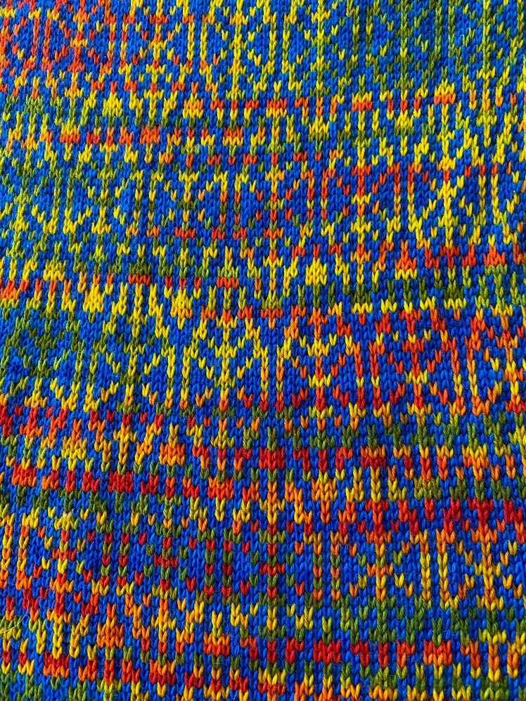 After success with the summer panel, I input the pattern for fall, the Leaves in Water pattern from Alterknits, also only 12 stitches wide, each side a mirror of the other. At this point I felt comfortable enough with the position of the keys that I kept my index finger on the gray key and my middle finger on the white key while looking only at the chart, with the row delineated with a Post-It. Again, no problems, no errors. The colors were a yellow-orange-green multi against a cobalt blue. From a distance, the colors blend together for an oil slick effect.