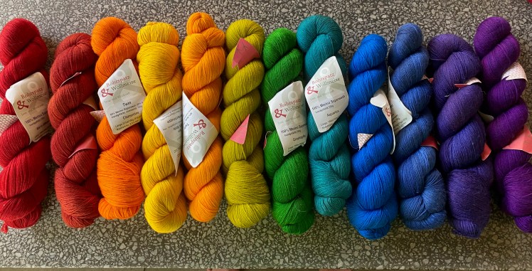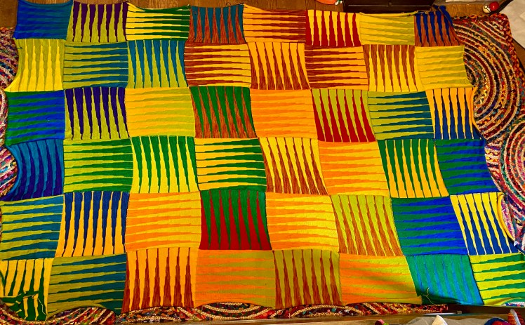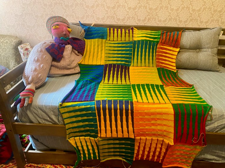 So I knitted and knitted and knitted. This wasn’t fast work. I started in the middle of July and knitted several hours a day, until my back hurt and my brain couldn’t be trusted not to do stupid things. We went on vacation away from my knitting machine for a couple of weeks in August, but when we were home again, I got back to work and only finished the temperature blocks in mid-September. In the process, the yarn use offered a practical insight into which temperature ranges occurred most frequently in Madison in 2023, because then I had to go back to my stash and look for more yarn in that colorway. The yellow-green (41-50º Fahrenheit) used more than three full 150 gram skeins. Fortunately, I had it and every other color I needed more of than expected. My bottomless stash had finally met its moment. I really had not anticipated how much yarn this blanket would require.