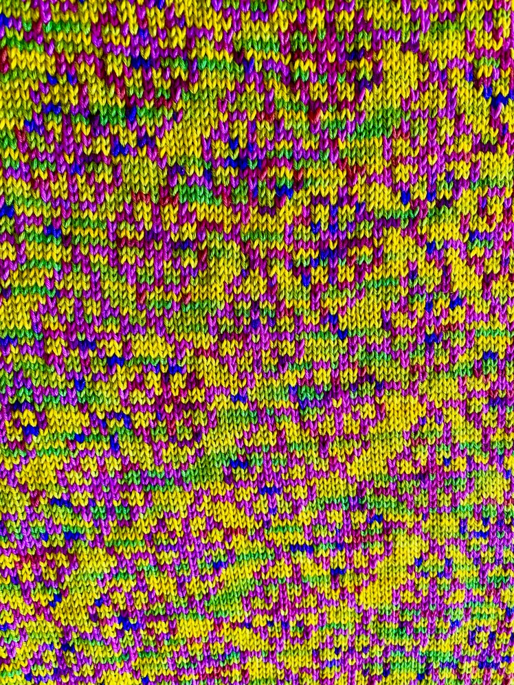 Because the knitting machine shows only the back side of the knitting, all of the work appears as the inverse of the intended orientation while the knitting is in progress, and then each square is worked from the side edge of a previous square, which is a further challenge to one’s spacial faculties. I had to work very hard to prevent disorientation, and sometimes I failed. Sometimes I had to undo squares that went out of order or were in the wrong place, and even worse were the times when I undid correctly positioned squares because I got disoriented. Eventually I learned to stick a clothespin onto the edge of the square from which I had to pick up stitches for the new knitting and stick stitch markers into the edge that was to be joined modularly to the new knitting. Then I laid the work flat to verify that the new square was correctly positioned and commanded myself not to second-guess myself during the process of knitting, no matter how confused I might and would get while the previous knitting was in strange places that didn’t make sense.