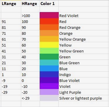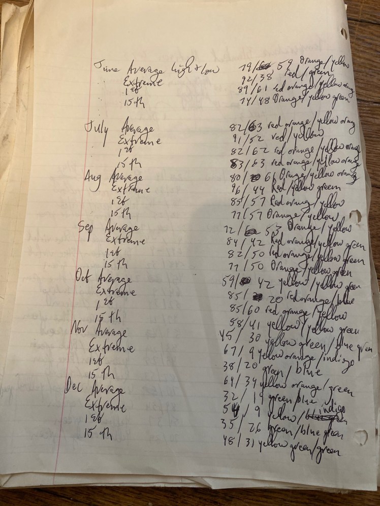 I had another set of questions that still needed answering, but now I could start to answer them. The first question was how many squares to make, and what period of time each square would represent. My decision was that the time frame would cover January to December 2023, 12 months, four squares per month, 48 squares, 6×8. I was still stuck on exactly which data to assemble for each square in the 4-square monthly blocks, but then another friend of mine finished a temperature blanket consisting of mosaic crochet squares whose colors represented the extreme temperatures for each week in 2022 in our hometown of Baltimore, Maryland. That seemed like a great idea to borrow for my blanket, in which one square would represent the month’s average high and average low, the square next to it would represent extreme high and extreme low, the square underneath on the left would represent the high and low temperatures for the 1st of the month, and the one on the right would represent the high and low for the 15th. Now that I had my format, I could finally research and assemble the data and assign colors to each pairing. This was my color key: