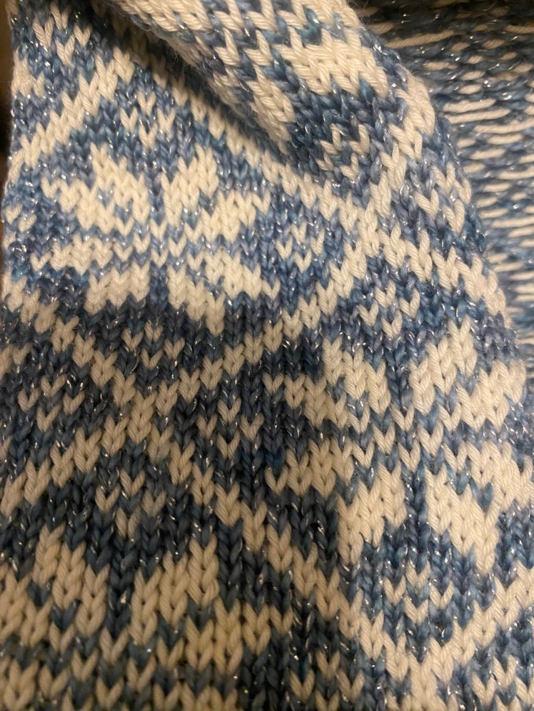 I saved the hardest for last. The final panel, winter, uses a traditional Fair Isle snowflake pattern from Mary Jane Mucklestone. It’s an all-over pattern, 48 stitches wide and 26 row high, and the chart is tiny and needed a lot of attention to keep my place. This time I did make a mistake, and I needed to learn how to fix it. I discovered that the inputted pattern can only be accessed by pressing the check program button and then using the directional arrow buttons to get to the stitches that need to be corrected. But the instruction manual was pretty straightforward, and now the pattern is completely right and I’m feeling pretty darned pleased with myself. It’s a beautiful pattern. The colors for this one are white snowflakes against a background of sparkly gray with a color fade of blue-gray to gray-blue to a sparkly variegated yarn of cobalt blue and deep aqua.