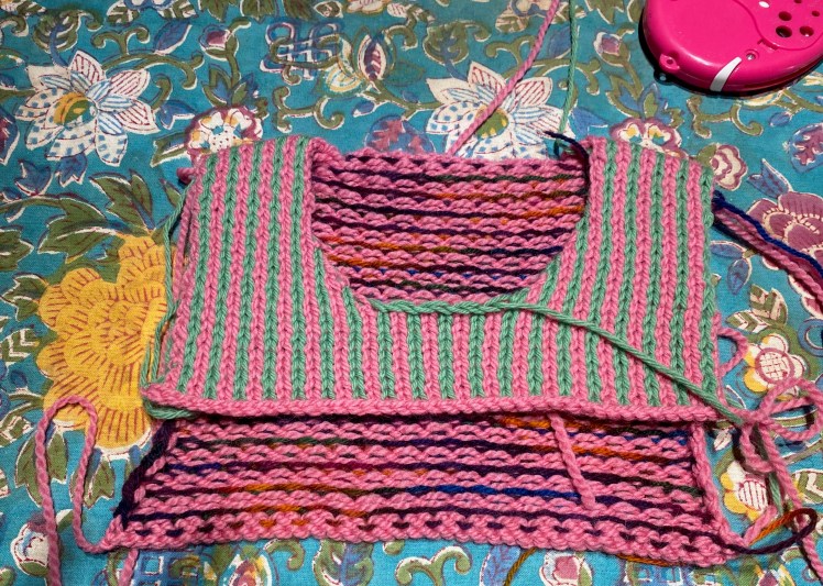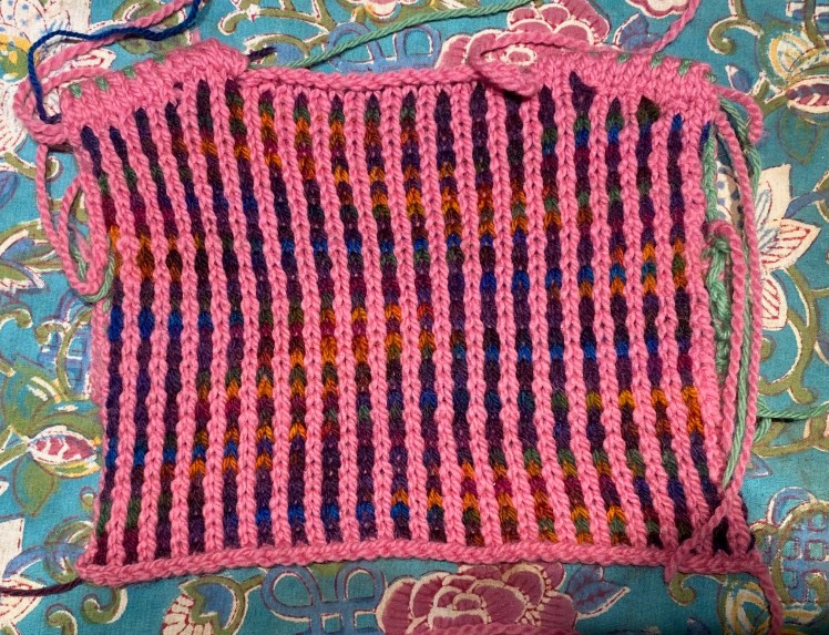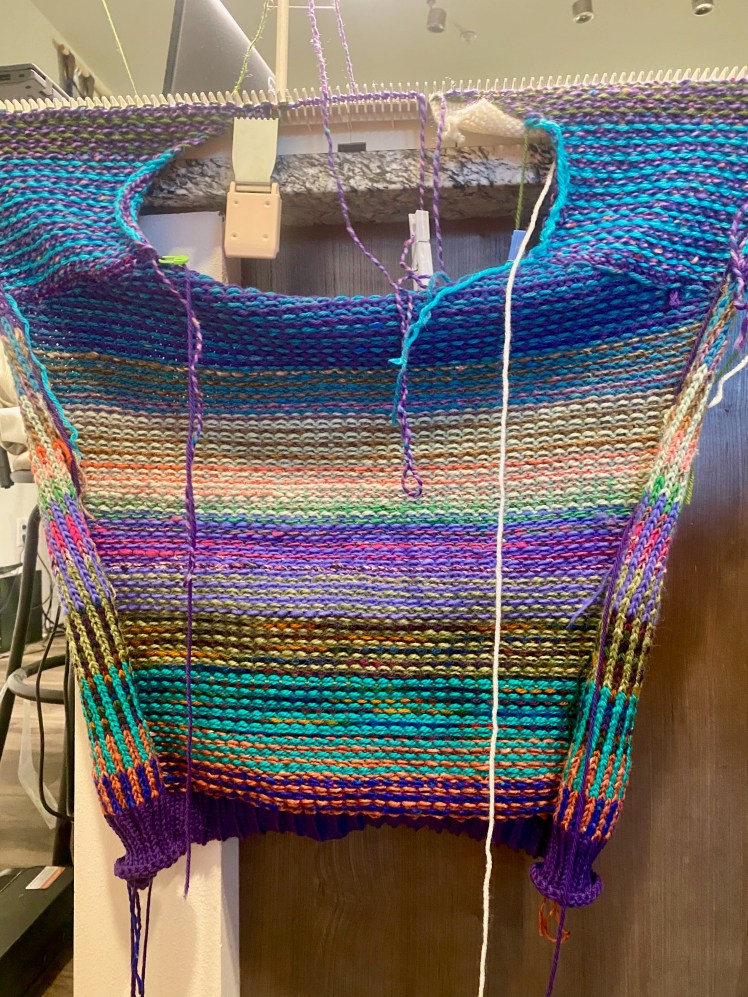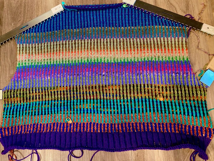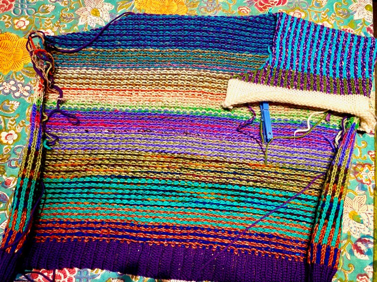 I chose not to match the front with the back on the top part of the garment, before the side seaming, but I did intend to match up the two sides at the seams, and I took careful notes indicating the rows where I did the color changes when I knitted the back so that I could do the same when I knitted the front. But when I got to the row after I joined the two halves of the front, I got my A and B colors off sequence so that I couldn’t align the color changes according to the row numbers on the front. I have finally figured out what I did wrong. There’s a 4-row sequence in stranded knitting with a Needle Beetle or on a machine that requires two rows to knit 2-color patterning. You start at the right with Color A, at the left with B, at the right with B, and at the left with A and knit it back to the right, which brings you back to the start of the sequence. I didn’t take that into consideration when I was doing the neck shaping. After I joined the left and right, I was starting the rest of the knitting at the midway point, with B on the right, so from that point on the color changes were going to be off-kilter. I had to give up on tidily matching the striping on the front and back. In the course of knitting the pieces on the knitting machine, which shows only the purl side of the knitting, I realized that the purl side was just as attractive as the front side, so I finished it very carefully so that there would be no visible ends to to prevent it from being worn either way.