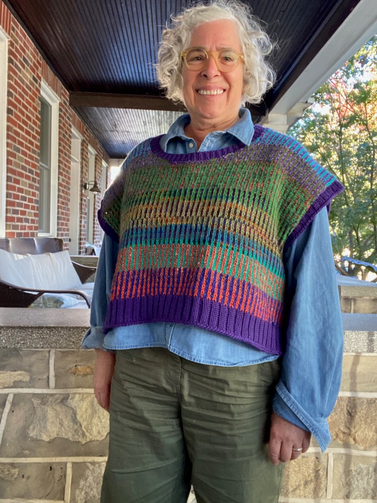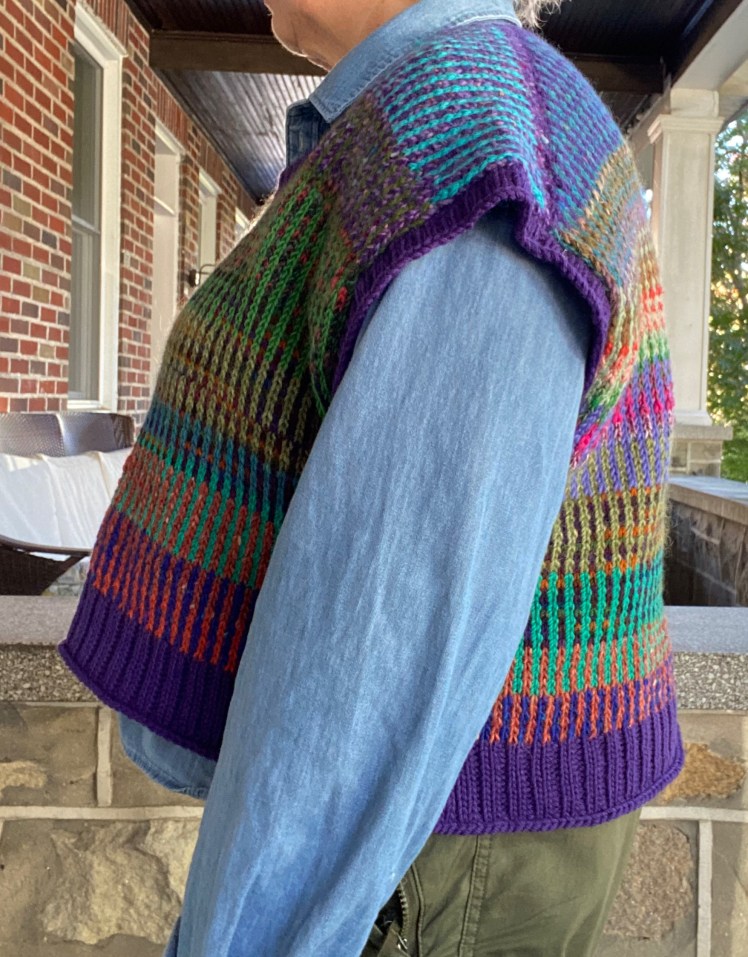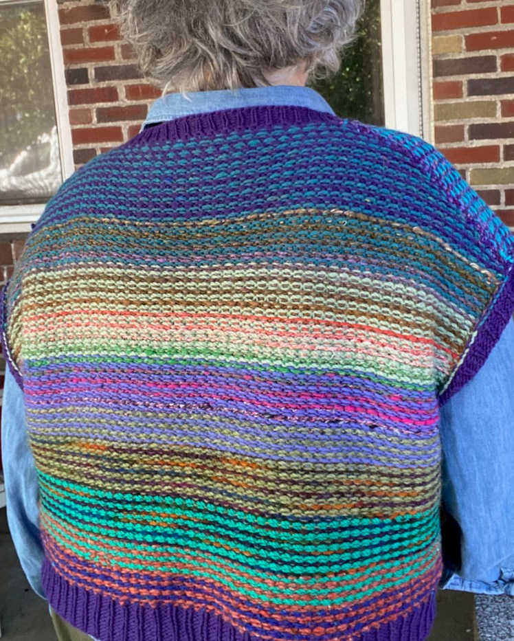 When I presented the vest to my sister, she admired the colors and workmanship, but she wasn’t sure that the short length suited her body. I assured her that it looked the way I had envisioned it on her, but if she wouldn’t be able to use it, I would gladly take it back. I just couldn’t promise her when I would knit her a replacement. So she decided to wear it for a while to see if she could get used to this unfamiliar style, and she seemed to warm to it. If she ends up not wearing it, I’ll take it back and will use the information to come up with something she likes better. Eventually.