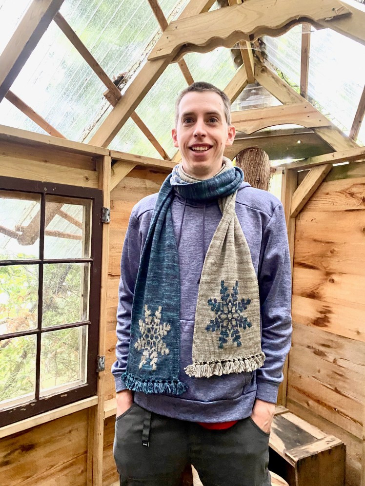 The scarf was fully assembled and finished in time to present it to my son-in-law when I saw him a few days after his birthday.