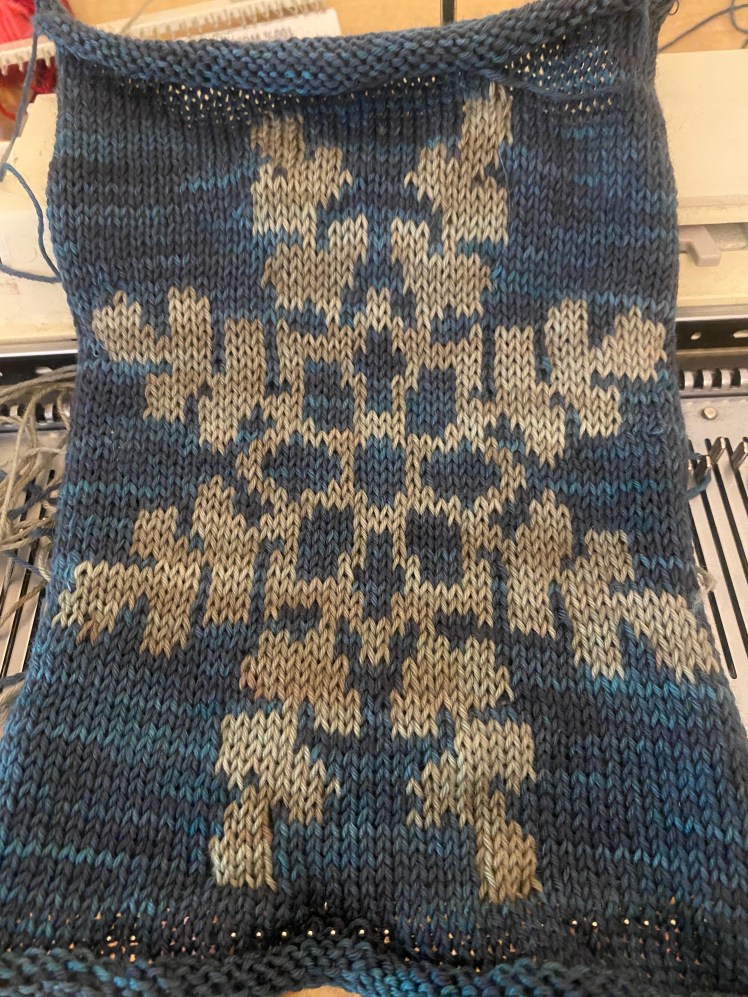 And my fears were justified. Of course inputting and programming the various operations become easy with repetition and practice, but the first time, or the first few times until it becomes muscle memory, there are a million steps to follow and a million ways to miss one or many of them. Then I feel like a cat stuck in a tree. How do I get out of this mess? The first mess was inputting the 44 stitches and 64 rows of my big snowflake pattern and losing my place repeatedly in pressing the white button and the gray button across a display panel that only went up to 10. When I thought I had it right, I knitted a swatch. I didn’t have it right. Fixing input errors is its own process, and it took me days to find exactly where my errors were, get the patterning sequences right, and hit the right buttons at the right time so that the machine retained the information. I wish I could remember what I did wrong and then what I did right, but I did get it right by Wednesday, after starting the inputting on Sunday. I was swooning with relief when I did get it right.