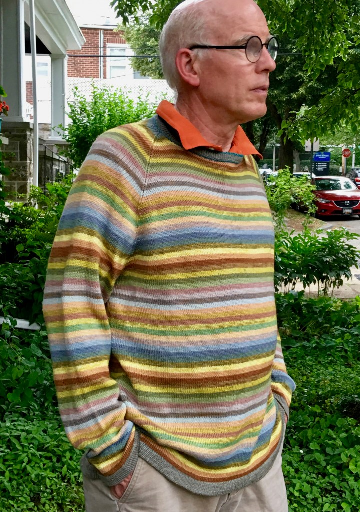 But there were other niggling irritants to take its place after I seamed the pieces together and wet-blocked the assembled sweater and finally pulled it onto Charles’ patiently submitting body. Why was there bunching in the armpit? Why was the sweater twisting around on his body? Why was the shoulder seam rippling? Why was it clinging to the curves and lumps of an aging man’s body instead of gliding tactfully over them? I had used the numbers for the previous sweater that fit Charles well, with the same kind of yarn and same stitch tension. So why was this sweater telling me that it didn’t want Charles to wear it, it wanted to be worn by DD2’s husband, who is six inches taller than Charles and very slender? I sat the new sweater down for a serious discussion. It belonged to Charles, and it was going to have to get to know and love him. I told Charles he needed to wear the sweater for a few hours a day for a couple of days so that it could get used to him and adapt to him. Everyone did what I told them to do, and the sweater has accepted the fact that Charles is its person.