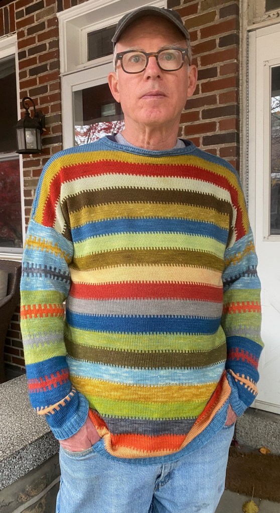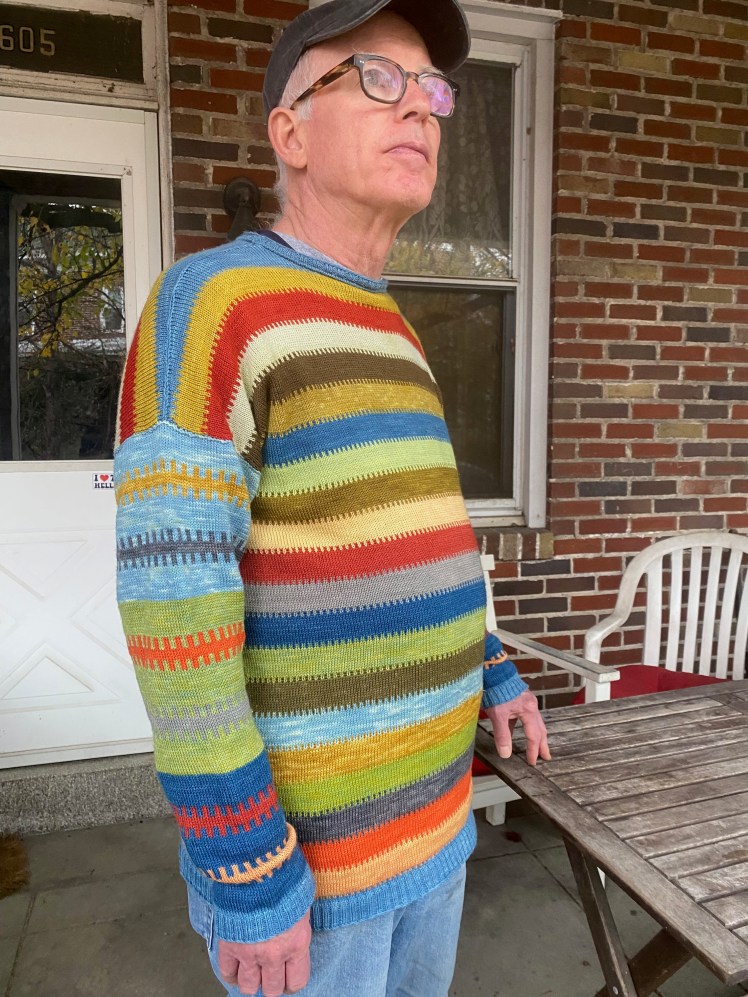 I have finally delivered on my promise to my husband to make him a sweater during sweater weather for his birthday in June. I knitted it on my KH965i, a standard gauge Brother electronic machine using preprogrammed patterns originally intended as knit-purl garter carriage patterns, but I set them up for fairisle knitting. The yarn is plant-dyed superwash merino in a heavy lace/light fingering weight, and I had 20 colors, including several larger skeins that were dyed or overdyed in indigo, and which got greater prominence in my color arrangement, since I had more yardage from them. Also I thought that the indigo skeins would hold their color better than the colors I had gotten from random plants I encountered in my rambles, back in the days when I was promiscuously dyeing everything I found, just to see what I might get. The sweaters I knitted from those experiments have faded to murky yellows, browns, and greens, which are actually very nice in a subtle, natural way. But I’m really hoping for some more stability from this set of plant-dyed yarns.