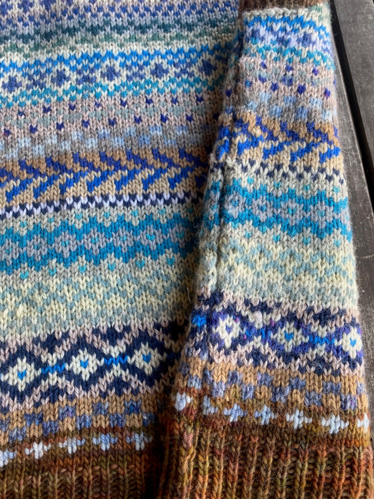 When my powers of calm and rational thought returned, I counted and recounted the number of needles in use until I knew for sure that I had 111 stitches of knitting, rather than the 121 stitches I had planned to knit. This meant that the generous ease I had built into the garment was gone, but thank goodness I had built it in, because, now that those stitches weren’t there, that left a garment with a traditional fit, not a bad thing for a garment that a British prince might have worn in the 1930’s for a game of golf. So, deep breath, it would still be a usable garment. But what about my plan to match the patterning at the side seams? Fortunately there was a solution that wasn’t as perfect as my original idea would have been, but it would be adequate.
