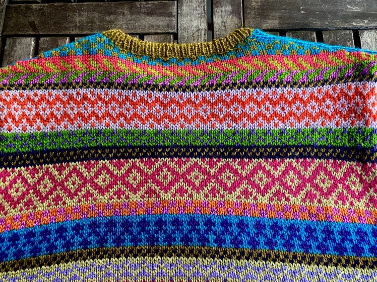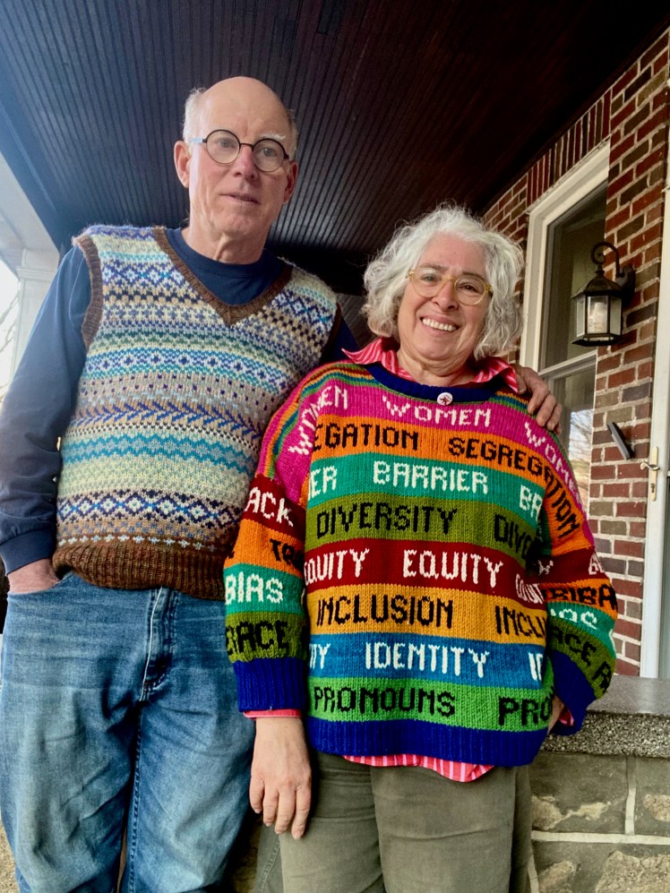 It was a huge relief to finish the machine knitting after the thrills and chills of navigating the complications and recovering from near-fatal mistakes. I looked forward to not doing this again. Then I sewed it up, hand-knitted the ribbing at the neck and armholes, and marveled at its perfection when my husband put it on, despite all the mistakes.
