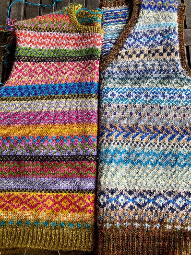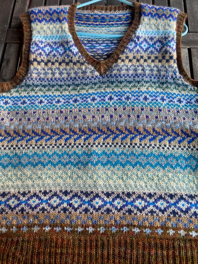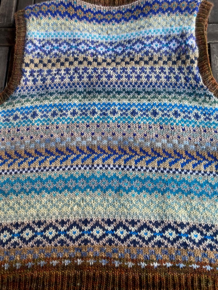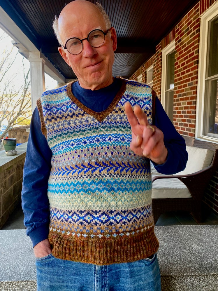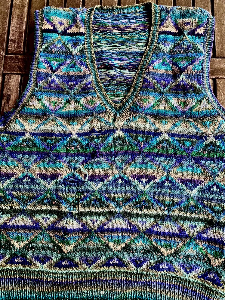 The moth-eaten vest he was wearing was one of my nicest works of Kaffe Fassett-inspired color work from my First Knitting Era, concentric triangles, three colors per row in blues and blue-adjacent hues, which is a colorway that I particularly like on my pink-complected, blue-eyed husband.