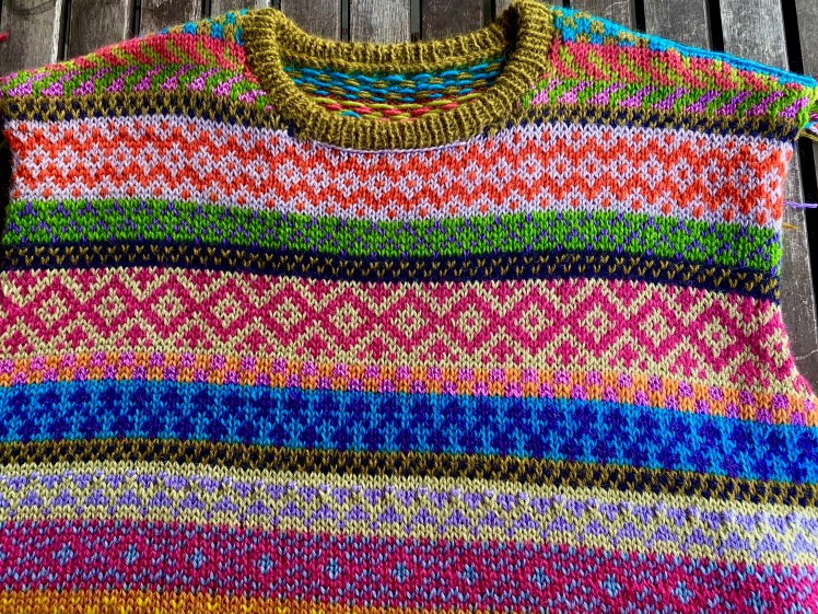 Now I have seamed together the front and back and have hand-knitted a folded ribbing at the neck.