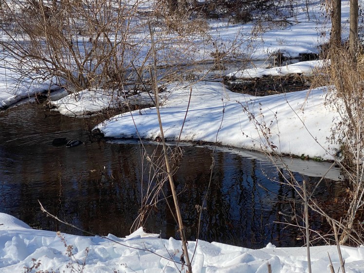 The plan for the new vest was to contrast a similar set of blues, blue-greens, and blue-purples against light natural colors, mostly from deep, ancient stash, including a ribbing knitted from a darker mid-brown mottled with murky green that I bought at Maryland Sheep and Wool back in the early ’90’s, maybe late ’80’s. We were in the midst of a deep freeze at the time and it was icy and scary to take our usual walk by the stream at the end of our street, but when we did get down there, I realized that my color choices had been influenced by the winter landscape.